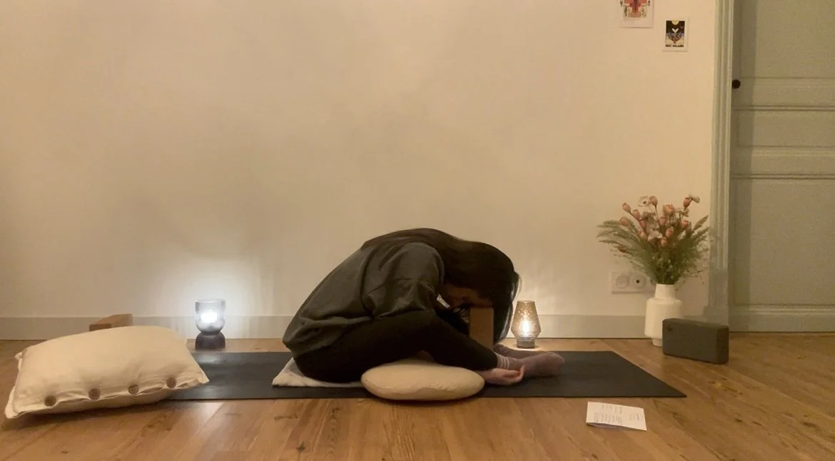 Une pratique pensée pour les jours de fatigue. Le corps est invité à se relâcher profondément à l’aide de supports moelleux et confortables.