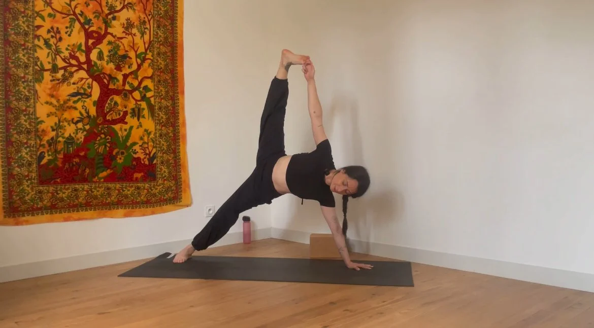 Cette pratique tous niveaux vous aidera à gagner en mobilité dans les hanches et les épaules, en souplesse dans les flancs et à comprendre comment s’engager dans la posture du compas.