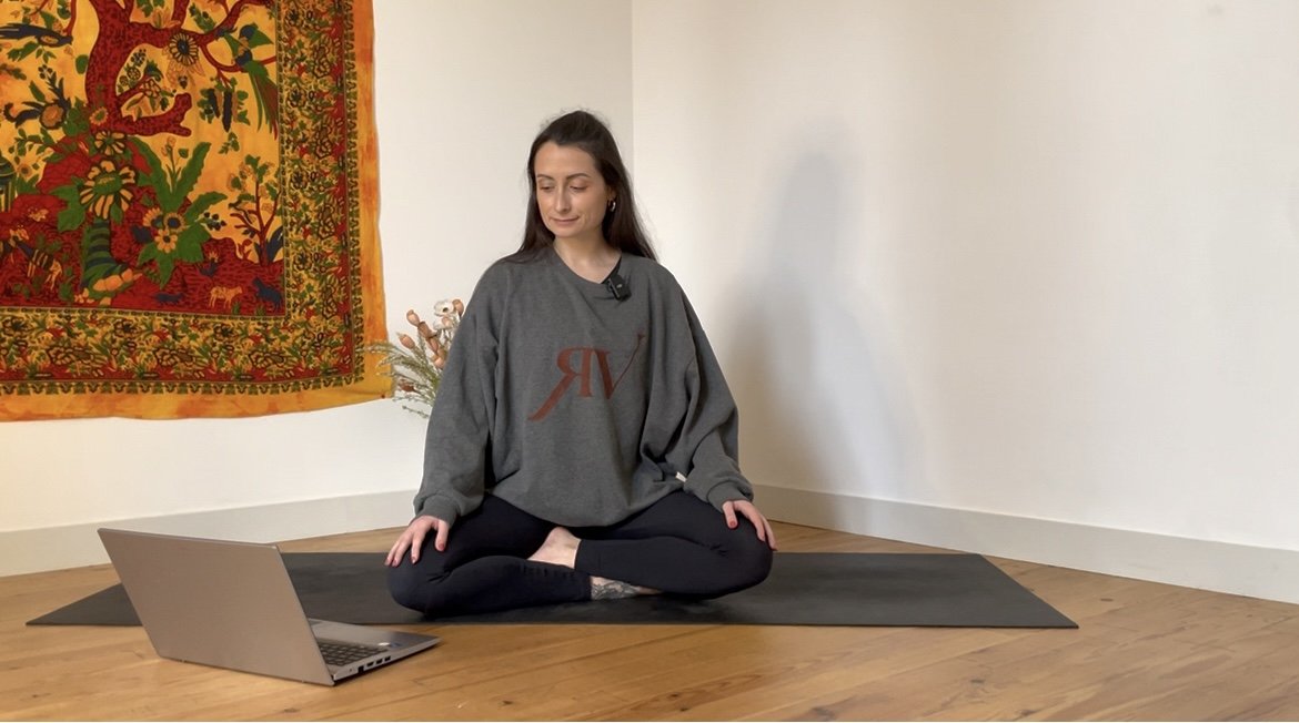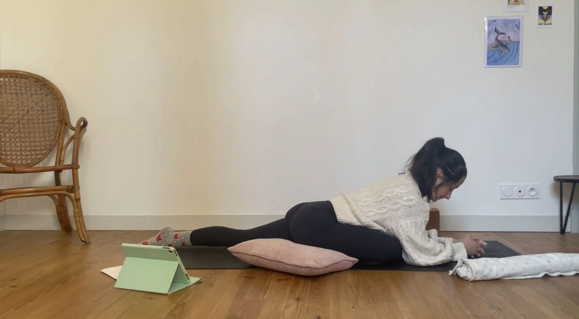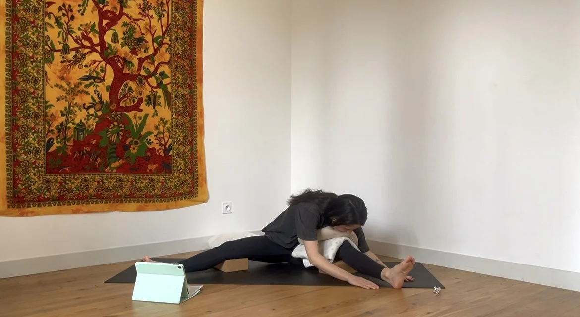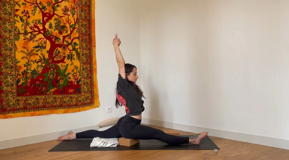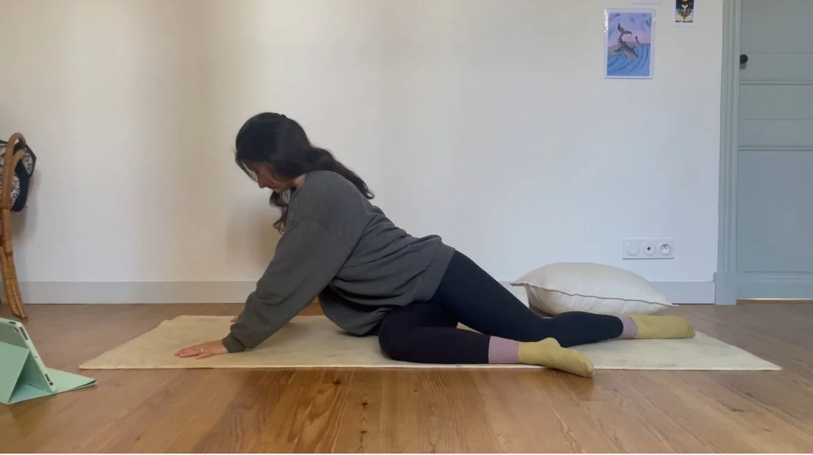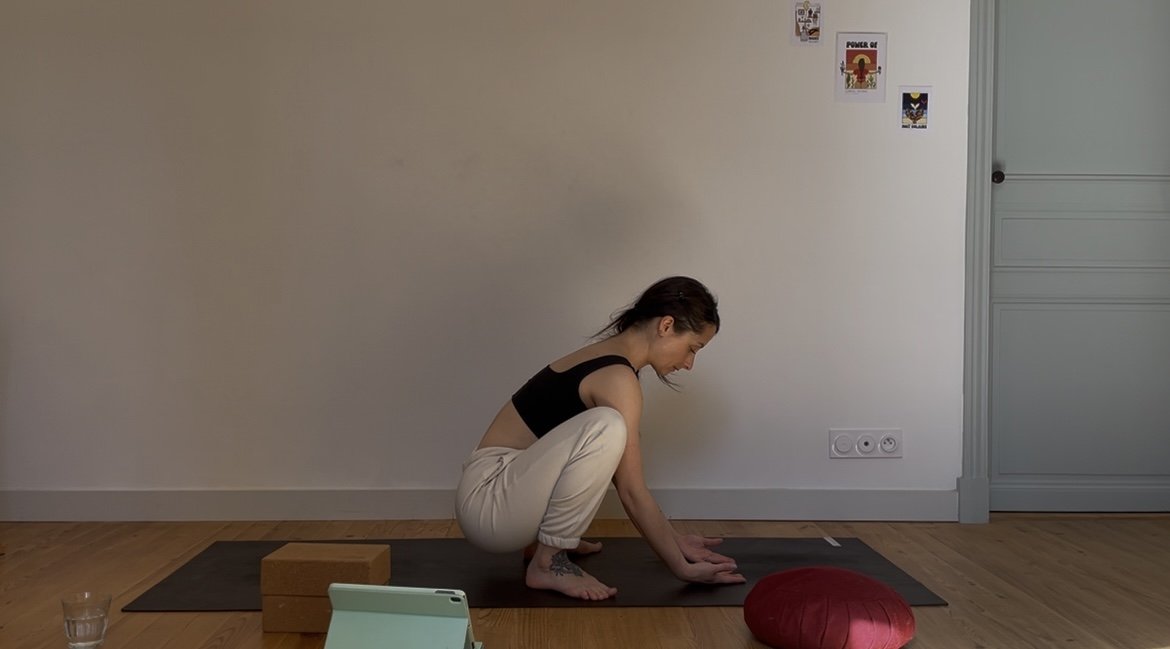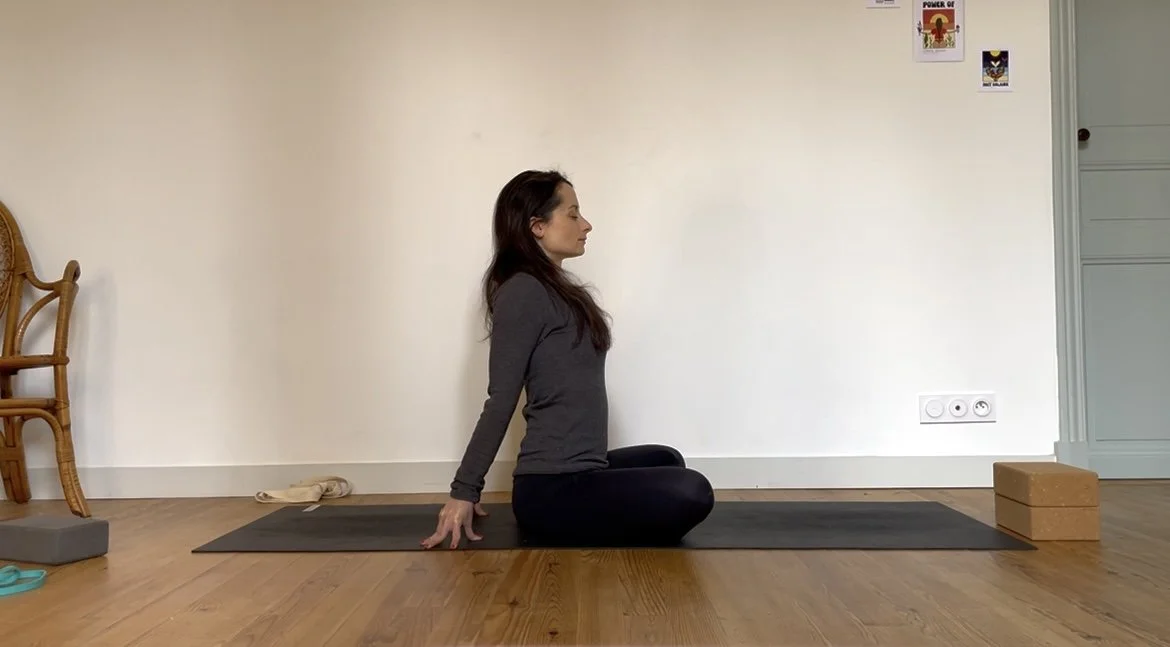 Quelques postures debout pour se mettre en mouvement, puis un moment prolongé autour de postures assises vectrices de stabilité et d’ouverture dans les hanches.