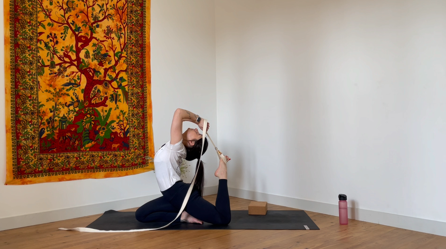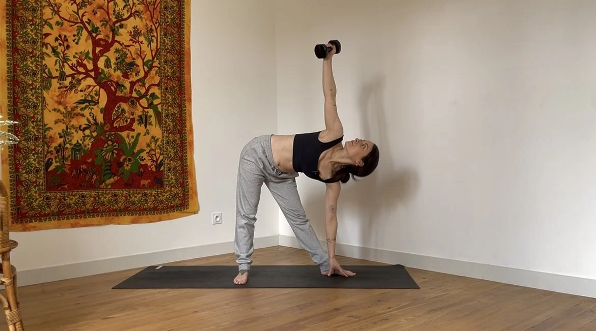 Matériel : un poids léger (bloc ou bouteille d’eau), un bloc de yoga, une sangle (ou ce qui s’en rapproche, type ceinture).