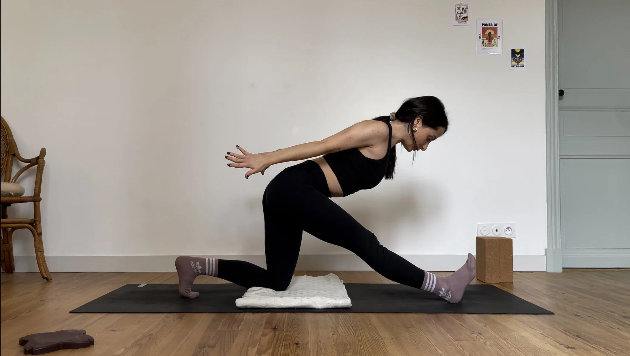 Matériel : blocs de yoga (ou équivalent), sangle (ou équivalent), pan de mur libre, plaid (ou accessoire sur lequel glisser).