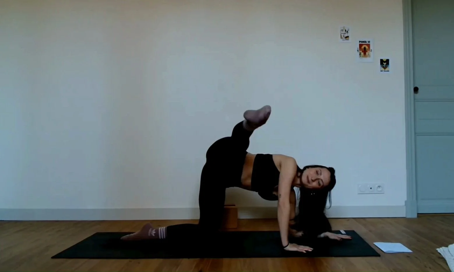 Un cours tranquille et hybride qui mêle plusieurs pratiques : de la mobilité, et des expérimentations au mur, et des postures tenues d’étirement.