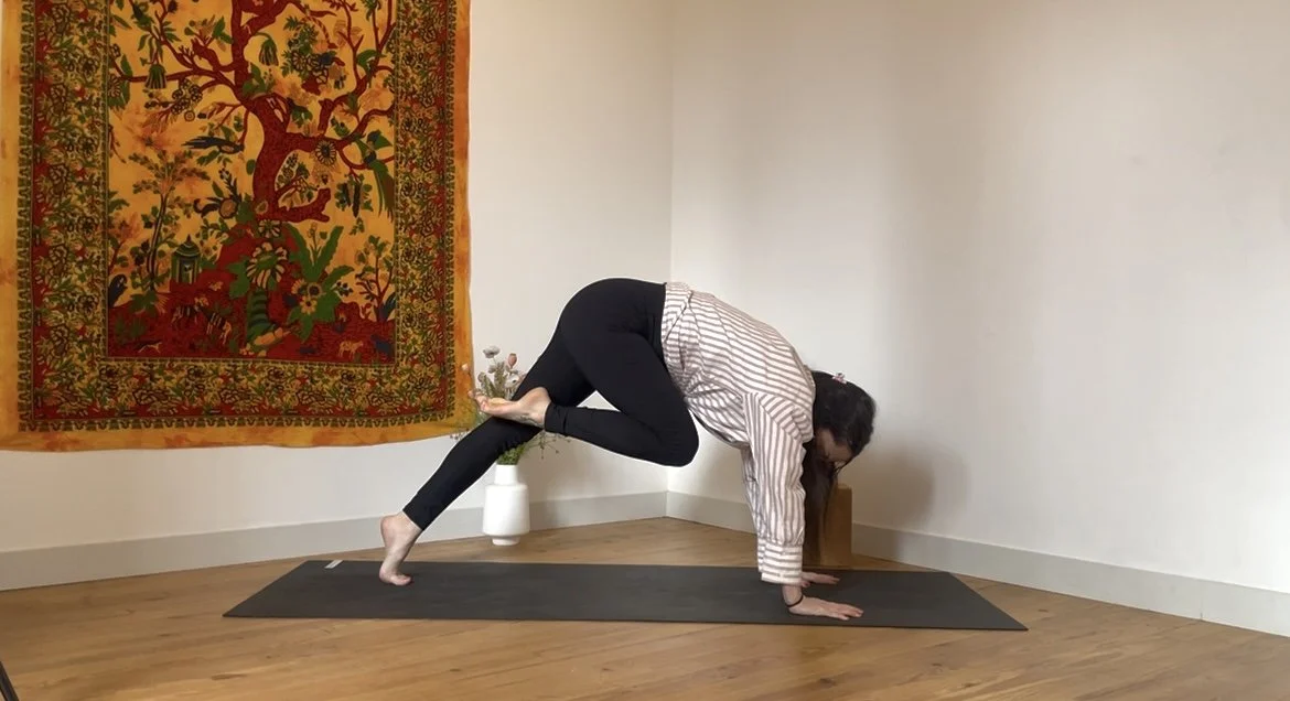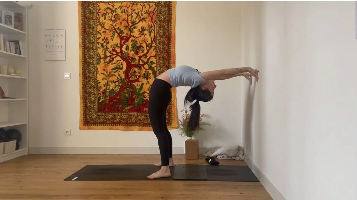 Pour approcher cette posture exigeante, rien de tel que de jouer avec le mur ! Le format atelier vous permet d’explorer en prenant le temps, aussi ne vous privez pas de mettre sur pause et de répéter les mouvements.